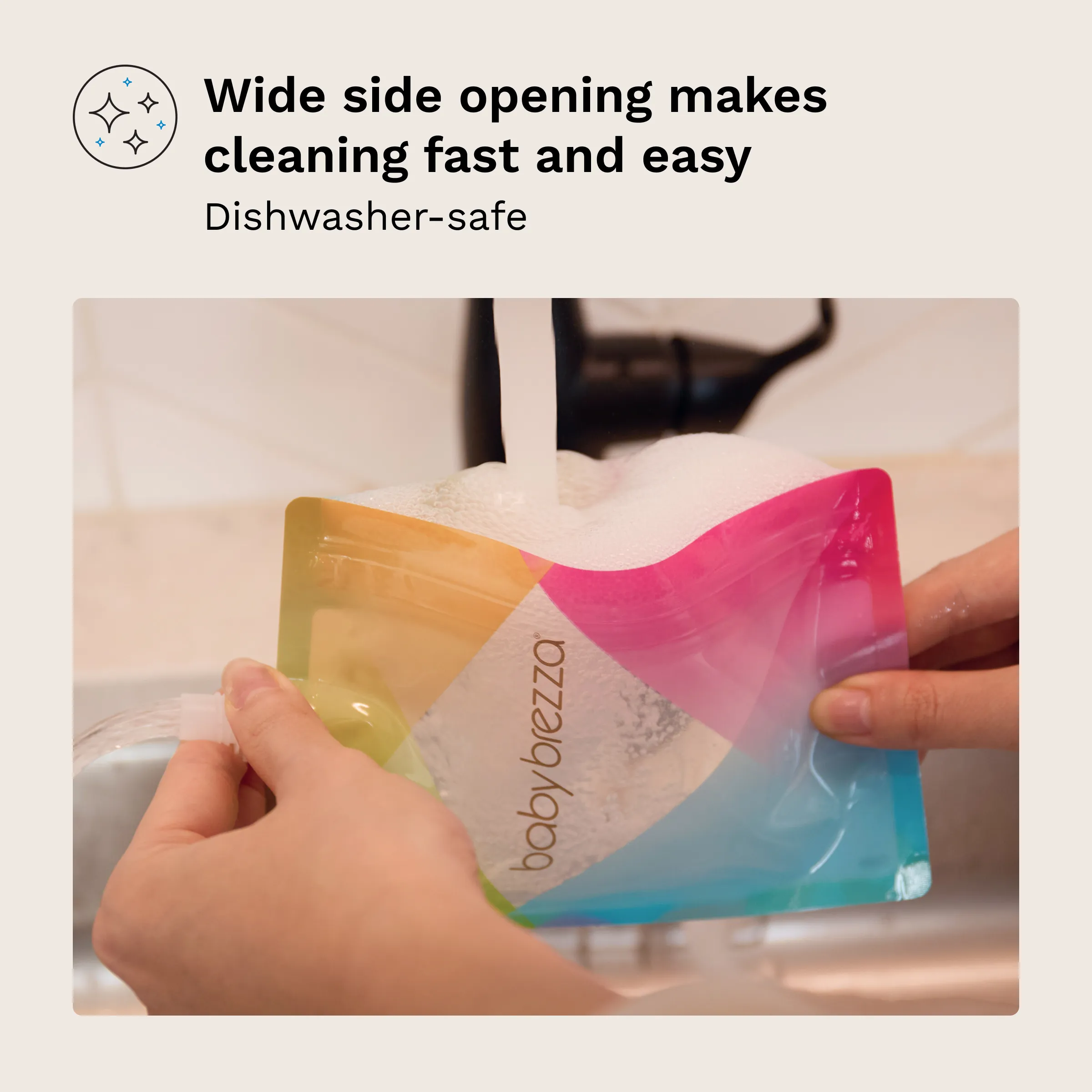 - Easy to Clean: No hard to reach corners to trap food. Wide opening allows for access to the entire pouch!