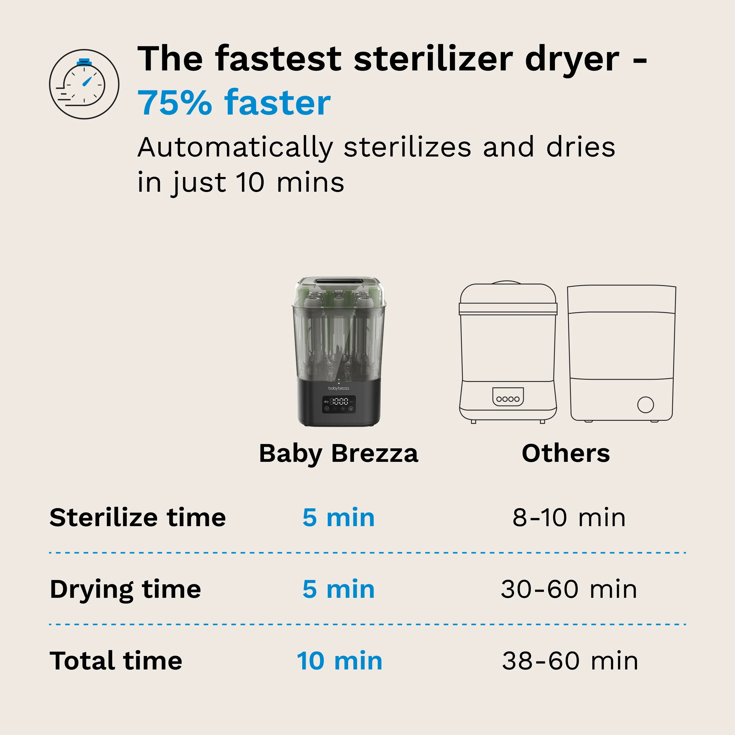 • The fastest Sterilizer Dryer - Automatically sterilizes and dries in 10 minutes flat; 75% faster than other brands